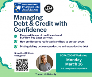 She provides confidential, one-on-one online sessions to support postgrad students’ financial wellbeing and money management.