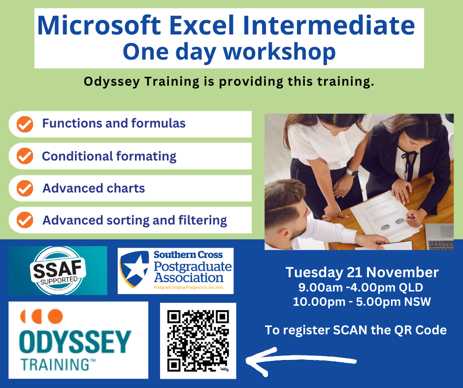 Register via Link: https://www.cognitoforms.com/SouthernCrossUniversity/MicrosoftExcelIntermediate2023 OR Scan the QR code below to register