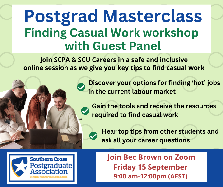 Register via Link: https://www.cognitoforms.com/SouthernCrossUniversity/PostgradMasterClassFindingCasualWorkGuestPanel