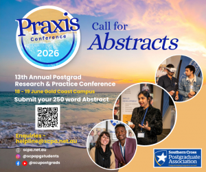 The Praxis Conference is a relaxed, supportive space where Honours, Masters, and PhD students can share their research and coursework journey—its challenges, insights, and wins—while connecting with fellow postgrads. Postgrads from all faculties and disciplines are welcome