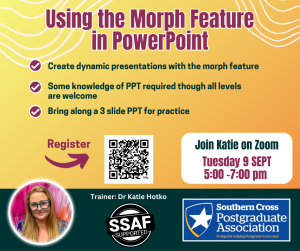All Honours, Grad Dip, Grad Certs, Master’s & PhD students are welcome to attend SCPA free workshops